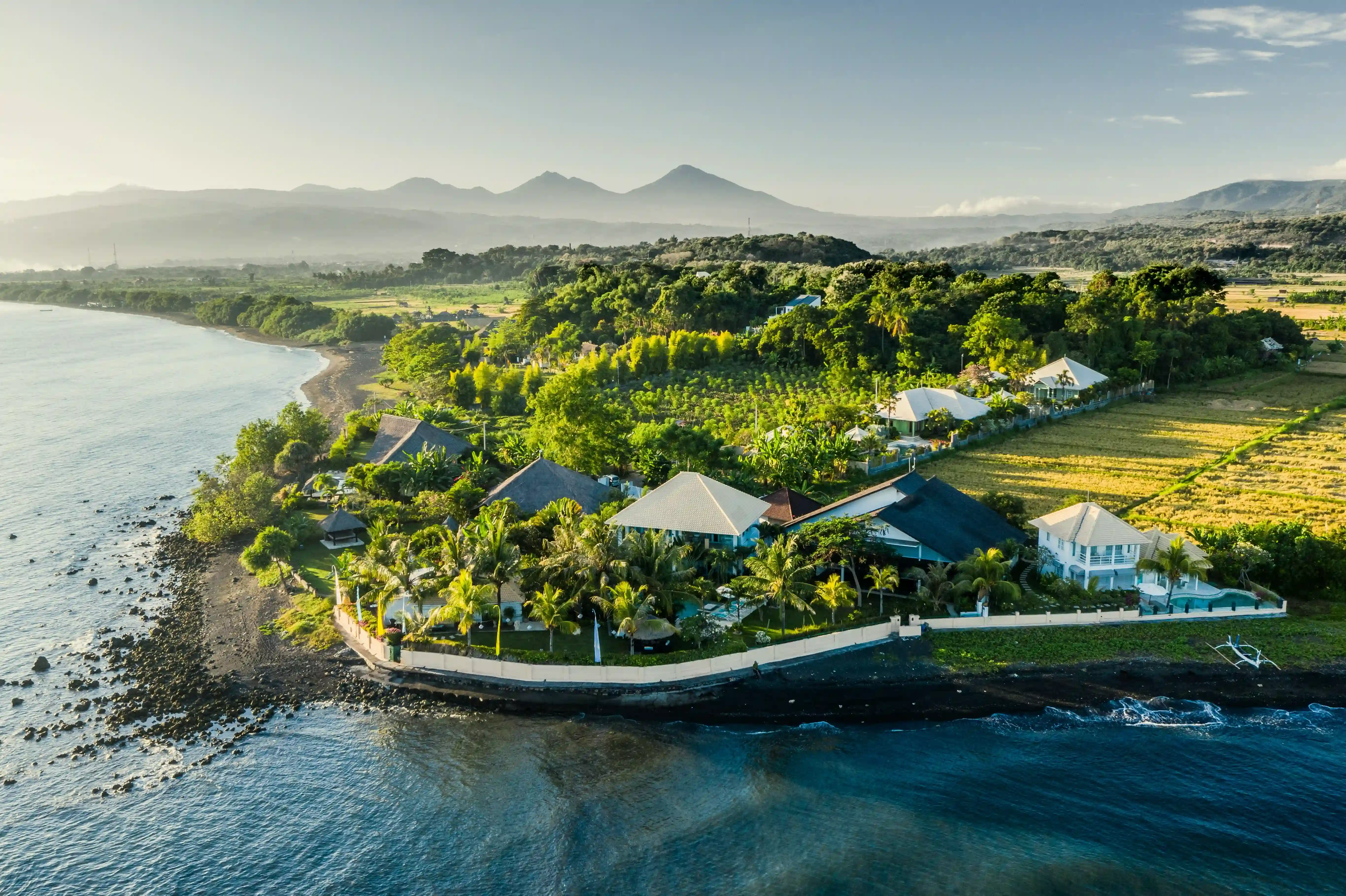 A stunning two-bedroom beachfront villa with a private pool, lush garden, and panoramic views of the ocean, rice fields, and surrounding hills.